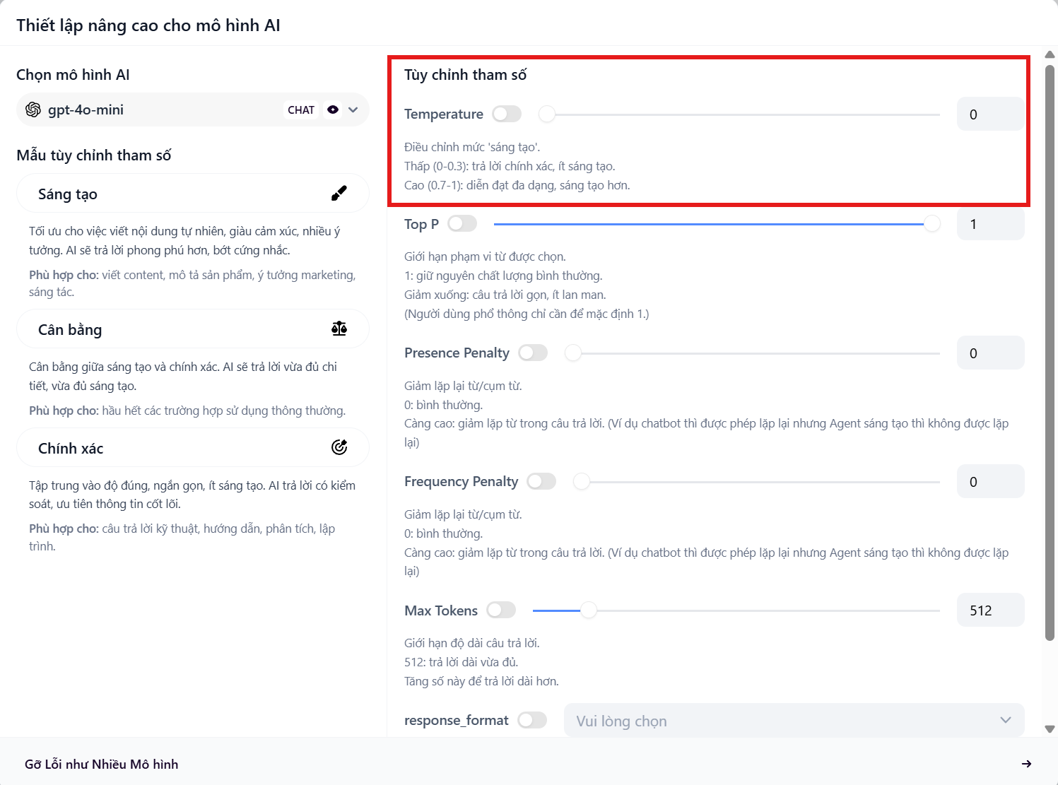 - Thấp (0 - 0.3): Bot trả lời chính xác, logic, ít sáng tạo. Phù hợp cho CSKH, Tra cứu đơn hàng.