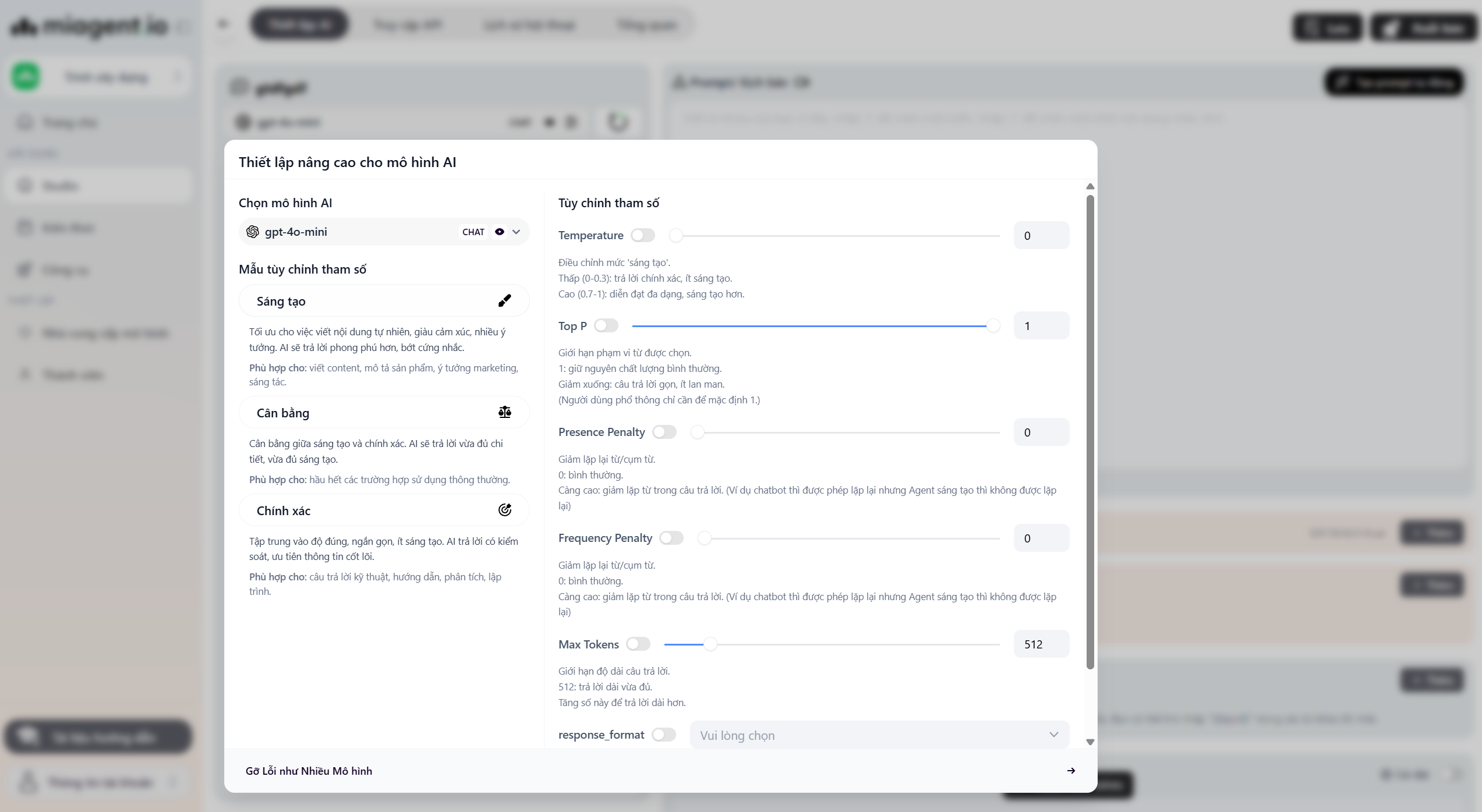 Phần tiêu đề “Thiết lập Mô hình AI (Model Settings)”Tại khu vực bên trái màn hình, bạn sẽ thấy các thông số điều khiển “bộ não” của Bot.
