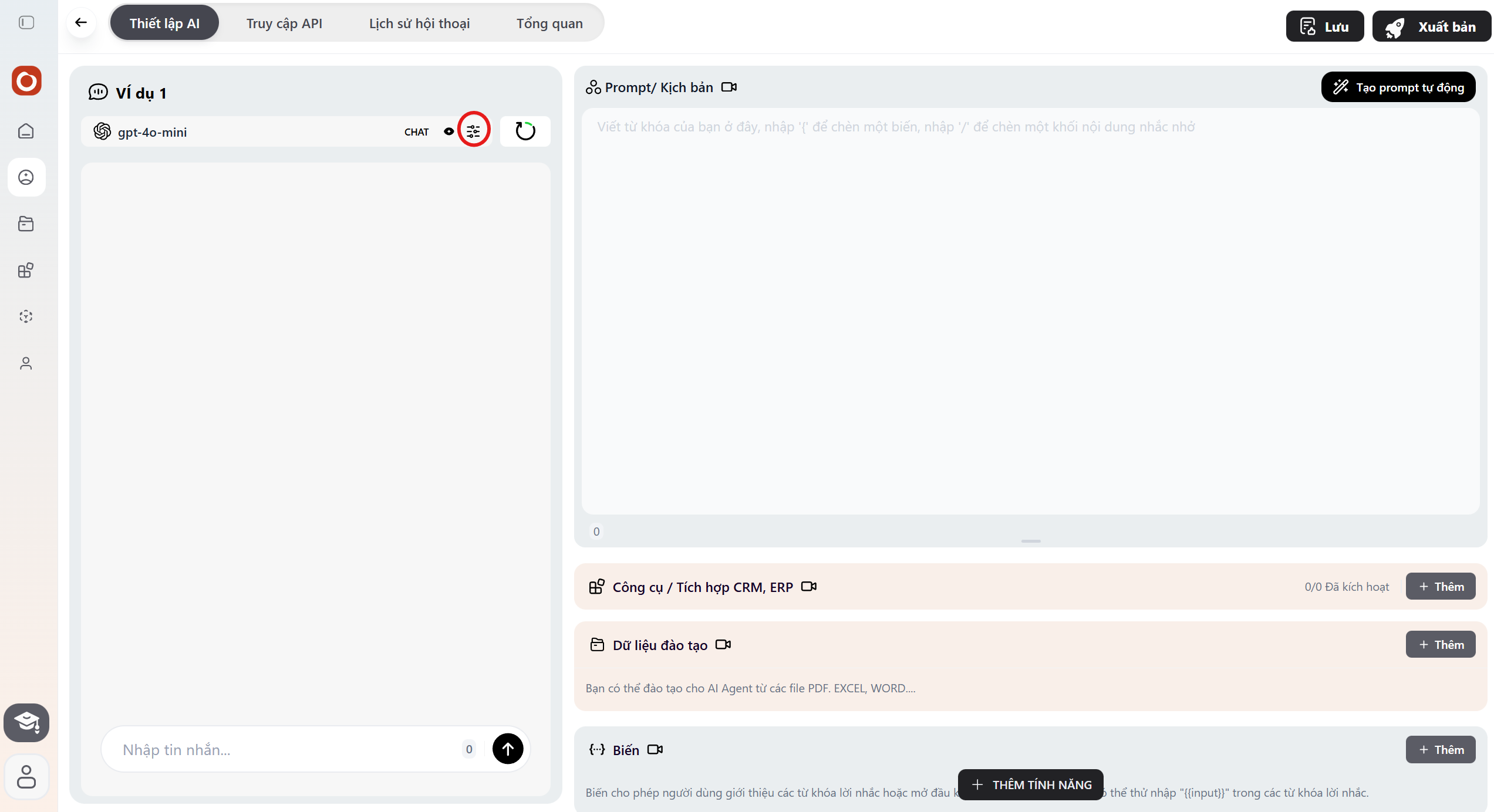 Phần tiêu đề “Advanced Agent Configuration”Sau khi tạo Agent cơ bản, bạn có thể tinh chỉnh các thông số kỹ thuật để Bot thông minh và phù hợp hơn với nhu cầu doanh nghiệp.