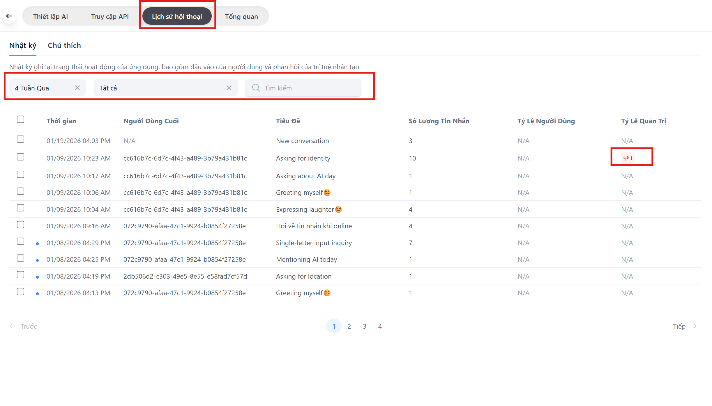 - Trạng thái: Lọc những câu trả lời bị khách bấm “Dislike” (👎) để sửa lỗi.