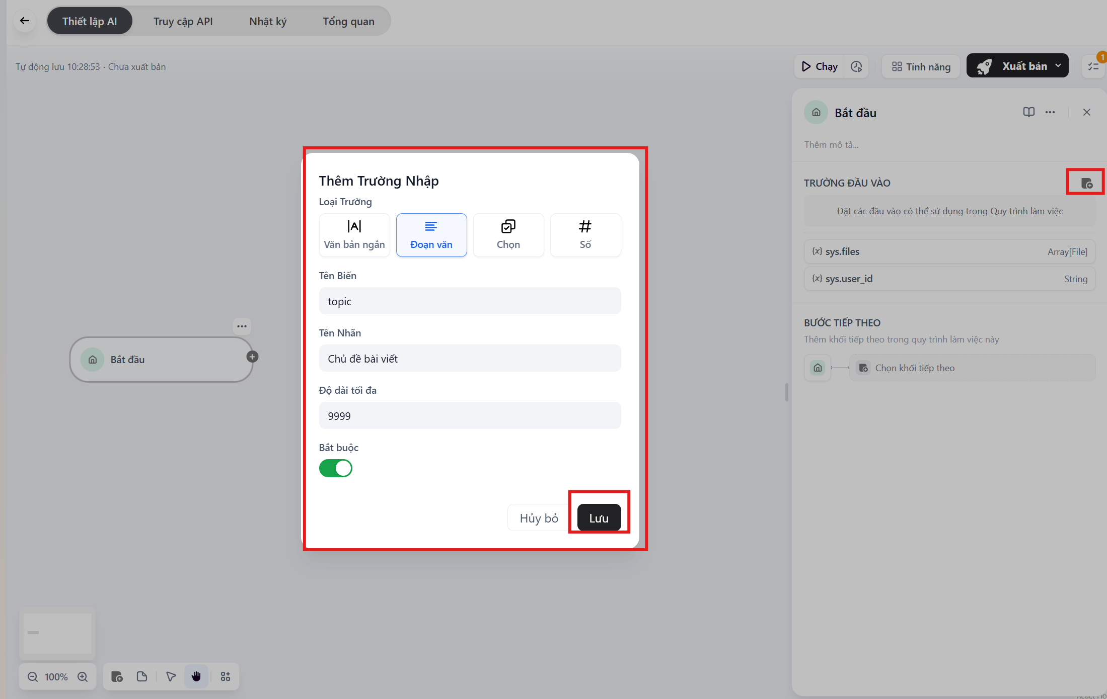 Phần tiêu đề “Bước 2: Cấu hình đầu vào (Start Node)”Chúng ta cần khai báo cho Bot biết người dùng sẽ nhập gì vào.