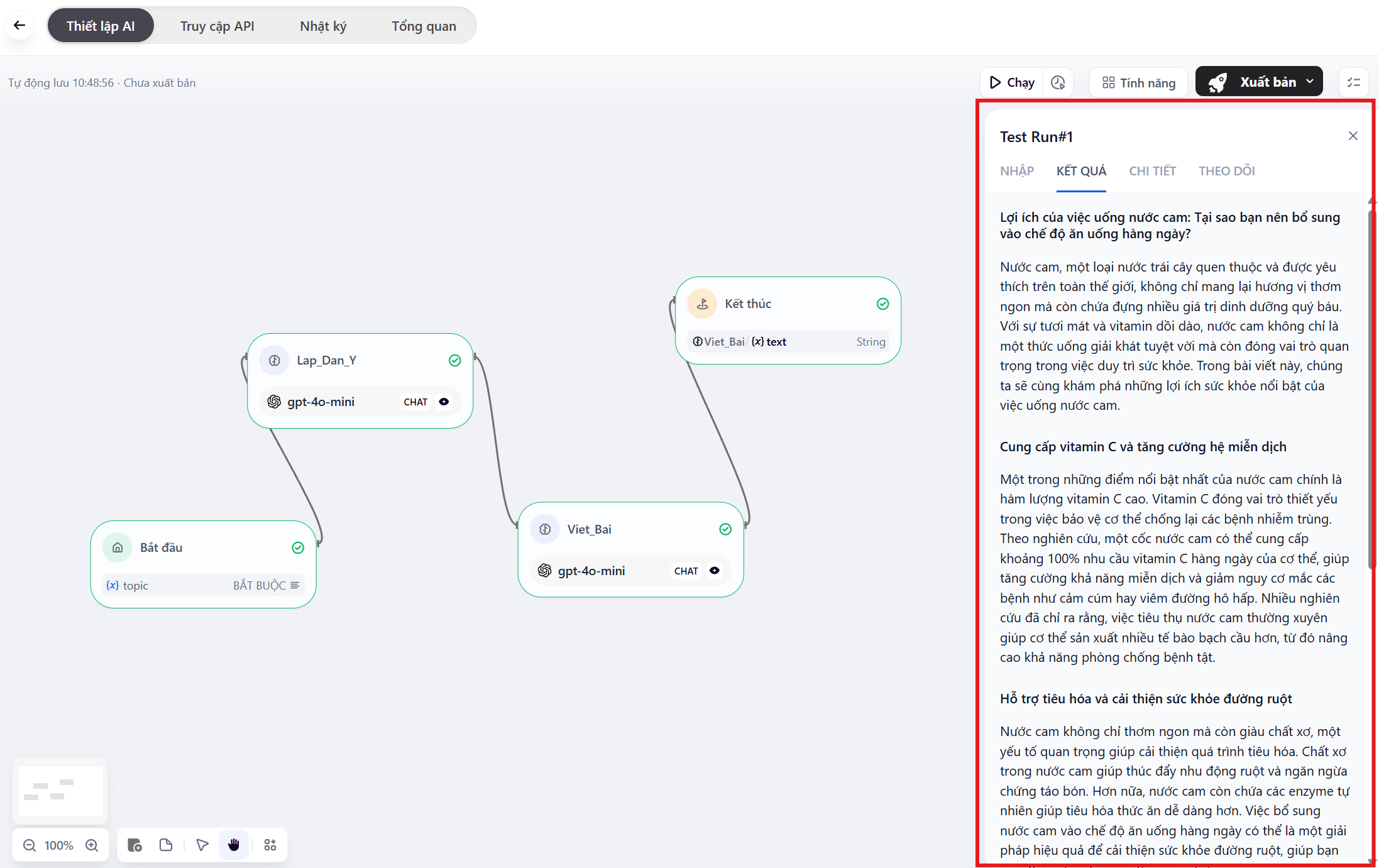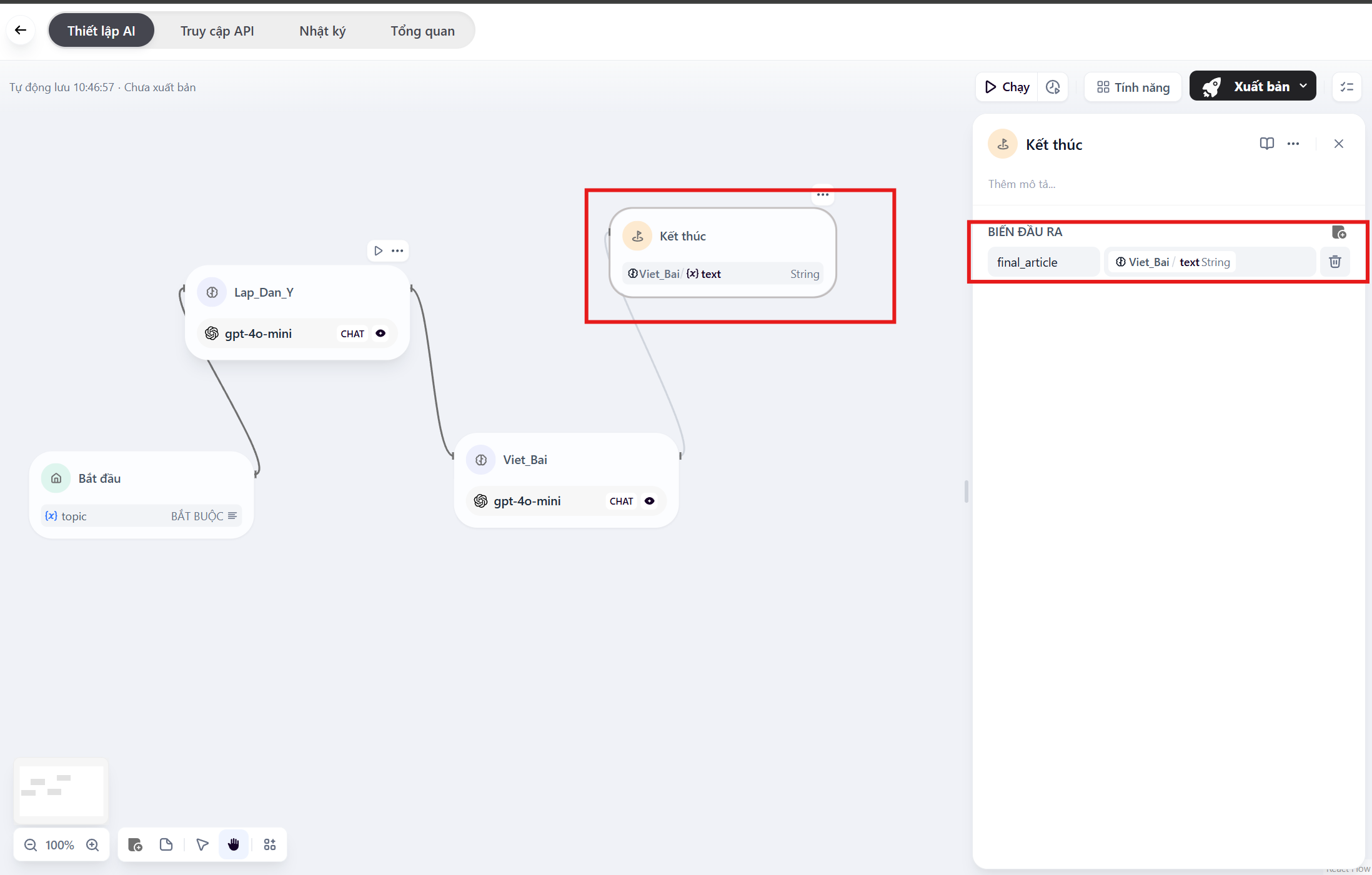 - Xuất ra nhiều định dạng: Tại node End, bạn có thể xuất ra cả Dàn ý và Bài viết cùng lúc bằng cách thêm 2 biến output.