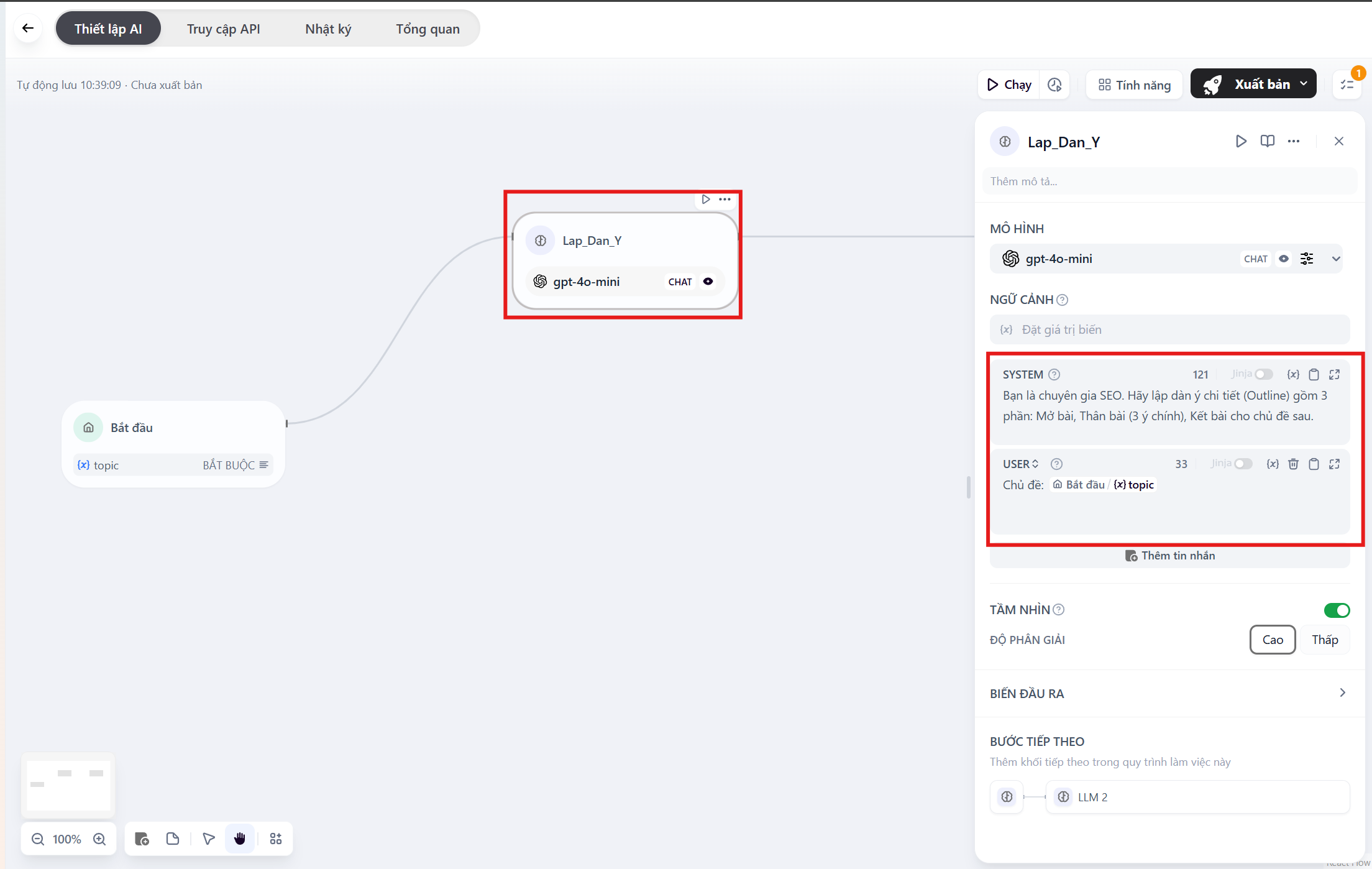 Bước 3: Tạo bước “Lập dàn ý” (Node LLM 1)